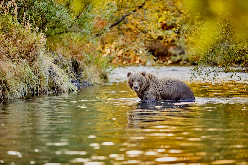 Med estimeret 30.000 bjørne er Alaska hjemsted for langt størstedelen af USAs brun- og grizzlybjørne. De kraftige, altædende dyr kan være op til tre meter høje, når de står oprejst, og de lever hovedsageligt af bær, fisk og små pattedyr. Ud over diende mødre og deres unger er de normalt alene, men man skal ikke blive overrasket, hvis man ser grupper af bjørne samlet til et festmåltid, når laks svømmer op mod strømmen. Sortbjørnene, der er mere almindelige end brunbjørne, strejfer også rundt i vildmarken. De er fantastiske klatrere, så man kan endda se dem slappe af oppe i træerne. Til trods for deres navn varierer deres pels i farve fra sort til grå til kanelfarvet. Nogle er endda hvide som isbjørnene, der lever blandt isbræer længere nordpå.