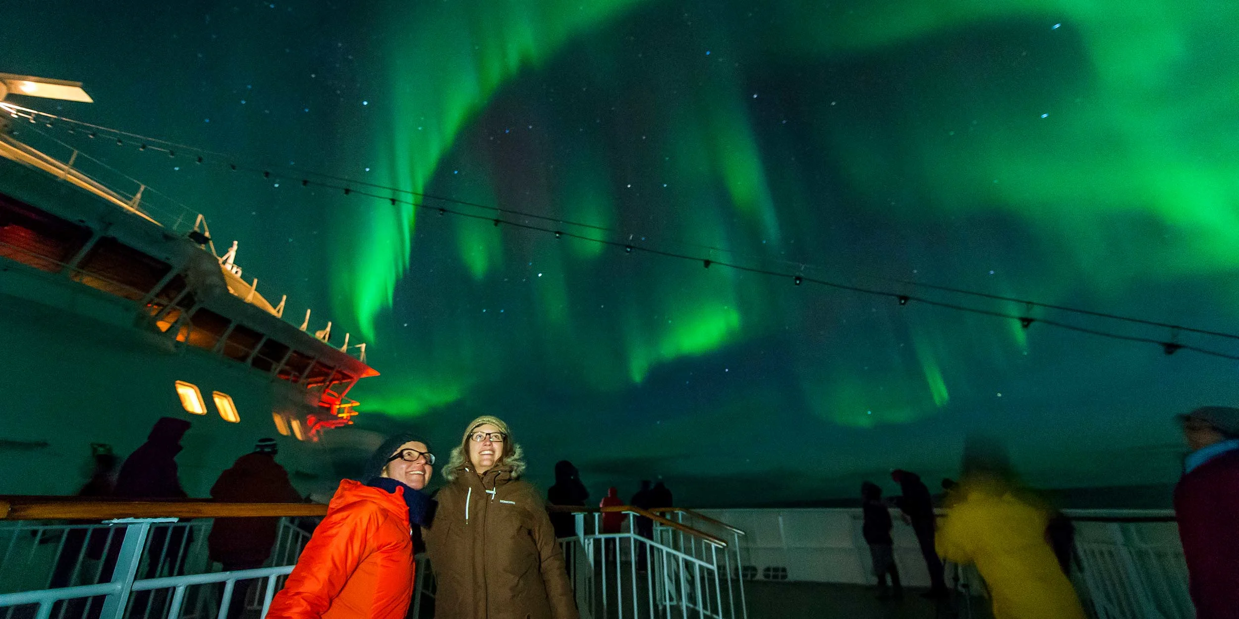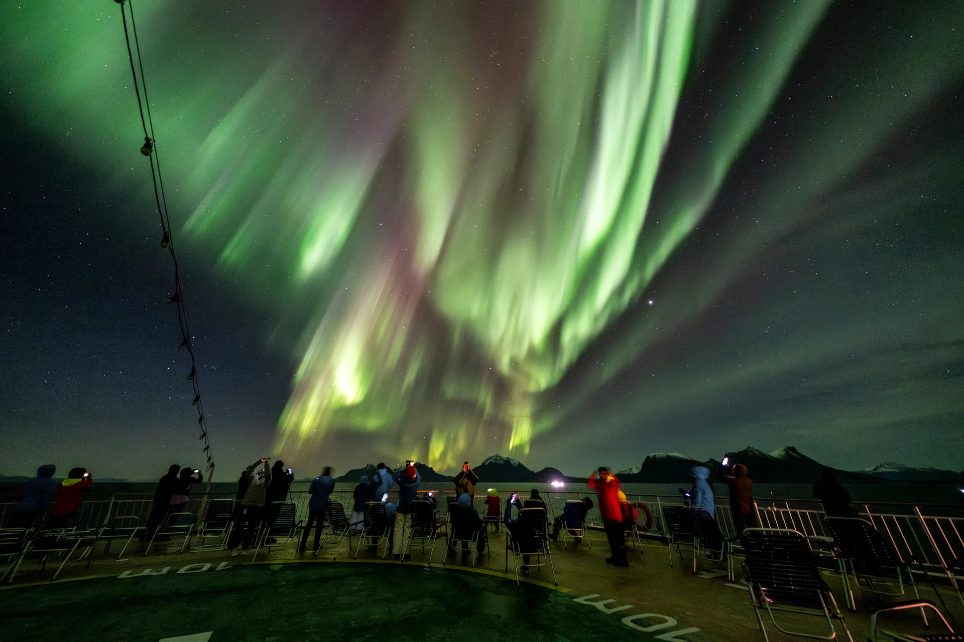 Når du står under eller tæt på en af de aurorale ellepser, har du størst chance for at se lysene. Når vi sejler mod polarcirklen, forbedres chancen for at se nordlysene, men der er mange faktorer at overveje når vi jager lysene. Læs vores ofte stillede spørgsmål om nordlysene og lær hvordan du kan øge dine chancer for at få et glimt af dette ærefrygt-indgydende lysshow på himlen.