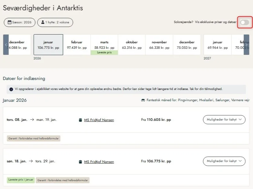 Vi fjerner af og til solotillægget helt på udvalgte ekspeditioner med afrejse inden for de næste seks måneder.