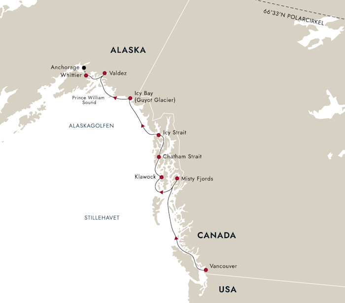 Tag med os på en oplevelsesrejse fra Vancouver til Seward, når vi rejser langt ind i Prince William Sound og oplever de majestætiske landskaber, den traditionelle kultur i Alaska og dyrelivet i den tempererede regnskov. Vi sejler gennem Den indre Passage og The Alaskan Panhandle, der er kendt for sine dybe fjorde, isdækkede gletsjere og knejsende fjelde. Mens vi sejler, holder vi udkig efter hvaler og spækhuggere samt landdyr som bjørne og elge.