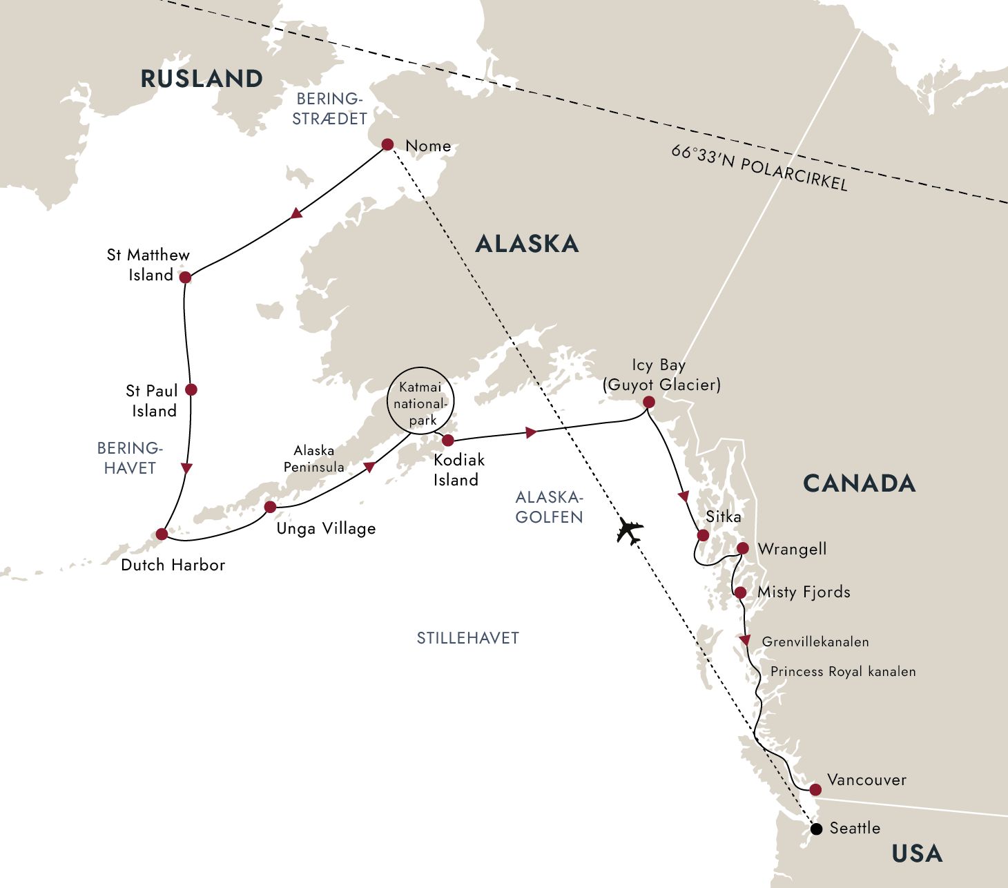 - Flyrejse på økonomiklasse fra Seattle til Nome før ekspeditionskrydstogtet.