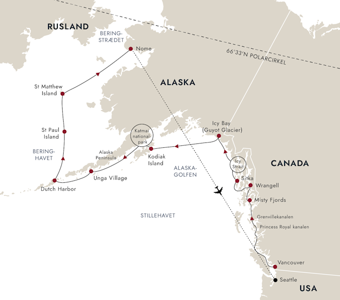 - Flyrejse på økonomiklasse fra Nome til Seattle efter ekspeditionskrydstogtet