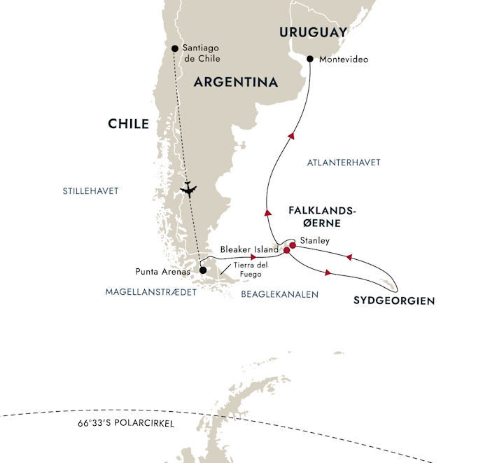 Rejsen fortsætter til Sydgeorgien, hvor vi ankommer i en livlig periode med stor aktivitet blandt dyrelivet. Pingviner og havfugle er ved at afslutte ynglesæsonen, mens elefant- og pelssæler stadig er aktive langs kysterne. Pukkelhvaler, spækhuggere og andre hvaler ses ofte undervejs. Vi vil nyde landgange og vandreture midt i det dramatiske landskab, inden vi begiver os videre til en anden del af Falklandsøerne og sejler nordpå mod Montevideo.