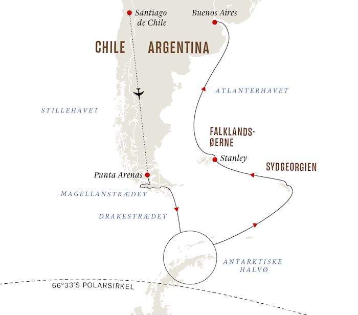 24-dages eventyrlig rejse til Antarktis, South Georgia, Falklandsøerne og Buenos Aires med kurs fra Patagoniens Punta Arenas.