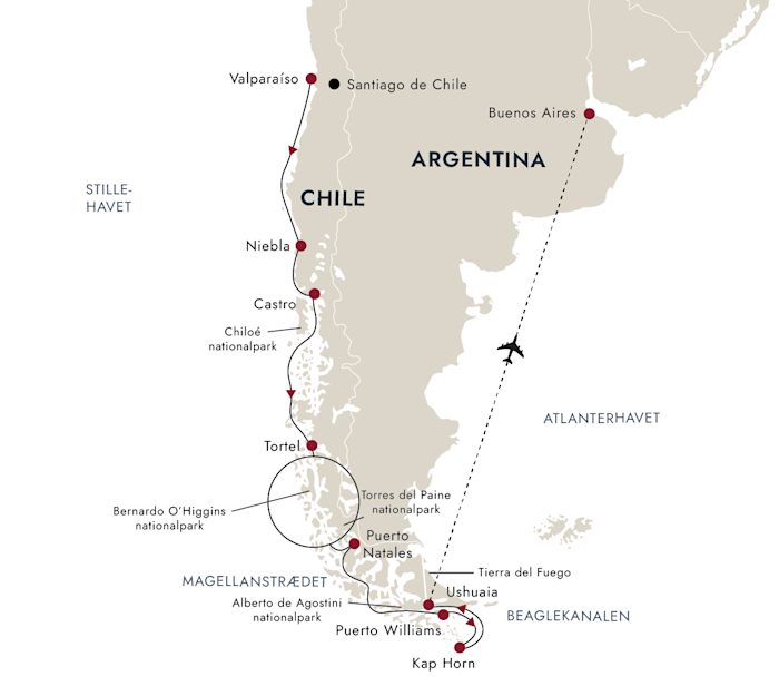 Sejladsen begynder i UNESCOs bakkejuvel Valparaísom, og vi sejler til det maleriske Niebla og det charmerende Castro. Mens vi fortsætter langs Patagoniens vestkyst, ser vi betagende landskaber, og vi bydes velkommen af fjerntliggende lokalsamfund og ser, hvordan de lever. Ved Puerto Natales kan man besøge den verdensberømte Parque Nacional Torres del Paine med dens høje granitbjerge.
