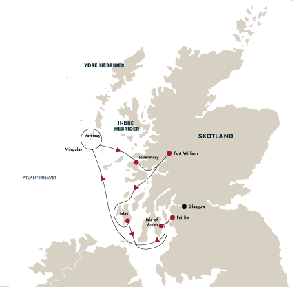 Fra Glasgow (Fairlie) rejser vi til de vilde og fjerntliggende øer i Hebriderne og oplever forrevne landskaber beklædt med lyng, hvide sandstrande og maleriske, historiske byer. Når vi sejler til Fort William, er vi omgivet af det fantastiske højland med bjerge og dale, der er formet af isbræer.