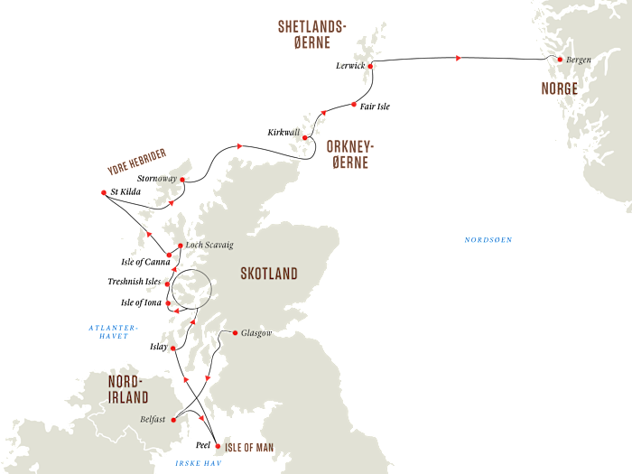 Tag med M/S Spitsbergen på et pragtfuldt ekspeditionskrydstogt, når vi sejler først fra Skotland til Belfast og Isle of Man. Følg whiskyruten på Islay, der er lige så berusende som sine tørveagtige dramme. Derfra udforsker vi de smukke ydre Hebrider, de vikingeinspirerede Orkneyøer og de fjerntliggende Shetlandsøer, inden vi sejler til Bergen.