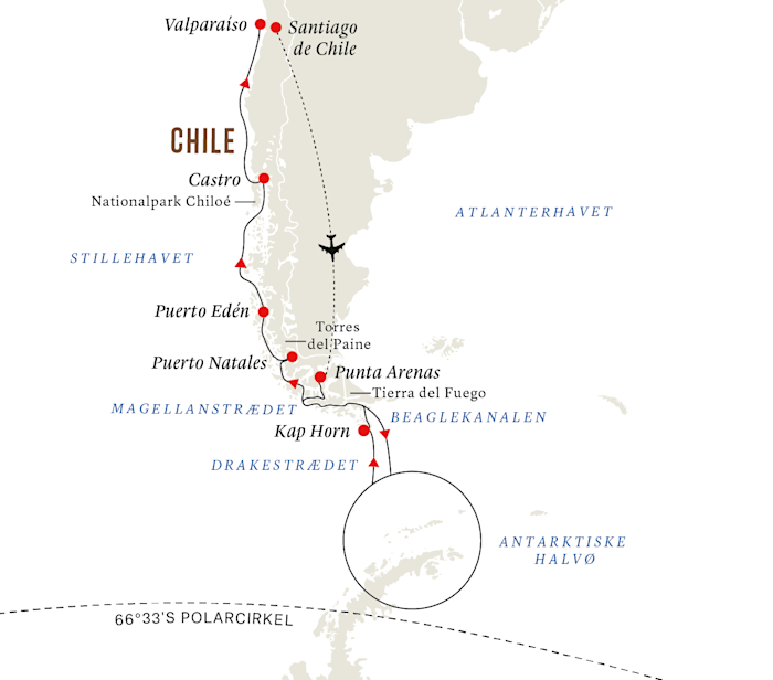 Chiles kyst er et sted med eventyrlige oplevelser og vidundere, lige fra smukke fjorde til små landsbyer. Vi stopper ved Puerto Natales, der er porten til nationalparken Parque Nacional Torres del Paine, og udforsker Patagoniens sagnomspundne farvande og kolonibyen Castro. Herefter går det videre til Valparaíso med dens farverige virvar af brostensbelagte gyder og smukke pladser.