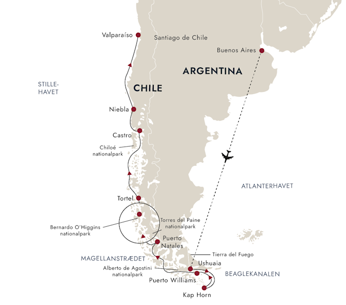Fra Buenos Aires flyver vi til Ushuaia, inden vi sejler til Kap Horn, hvor vi forsøger at gå i land, hvis forholdene tillader det. Derefter sejler vi nordpå langs Sydamerikas vestkyst gennem Chiles betagende fjorde. Den forrevne labyrintlignende kyst er overstrøet med øer, stejle bjerge og glitrende gletsjere – et perfekt område til udforskning i ekspeditionsstil.