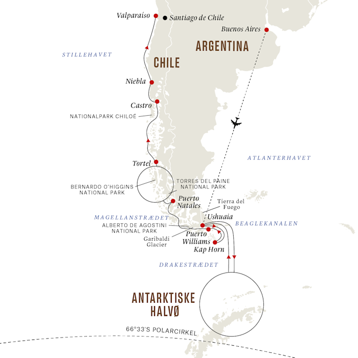 Eventyrrejsen begynder i Buenos Aires, og herfra flyver vi til Ushuaia og går ombord på ekspeditionsskibet. Vi krydser Drakestrædet til Antarktis’ hvide vildmark, hvor vi beundrer de store isbræer og isbjerge og oplever den majestætiske natur, når vi navigerer i de evigt skiftende islandskaber og møder Antarktis’ dyreliv såsom pingviner og hvaler.