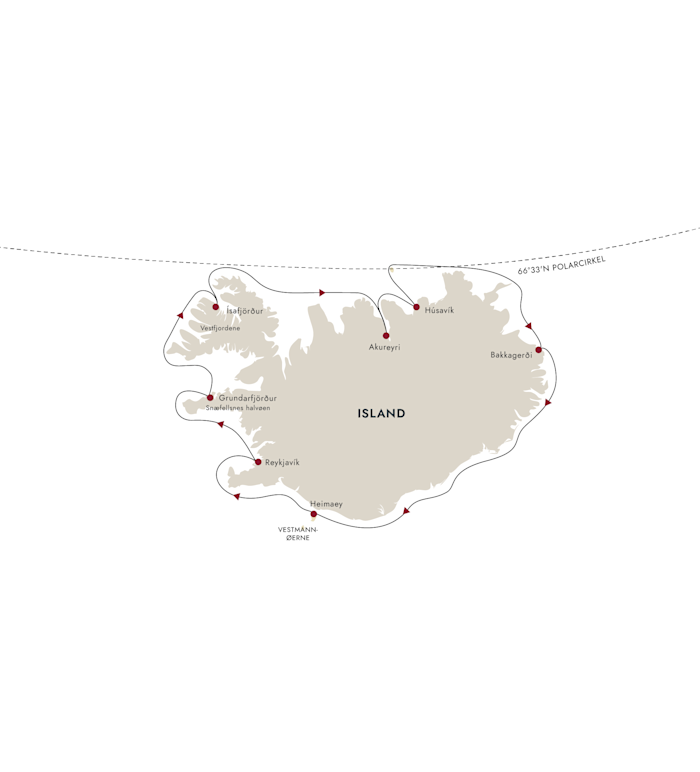 Húsavík anses også for at være porten til mange af det nordlige Islands seværdigheder som Jökulsárgljúfurs Nationalpark, vandfaldet Dettifoss og den hesteskoformede kløft Ásbyrgi, der ifølge islandske myter blev formet af en hestesko fra Odins ottebenede hest, Sleipner. Senere sejler vi langs Grímseys kyst uden at gå i land og krydser polarcirklen, inden vi fortsætter til næste destination.