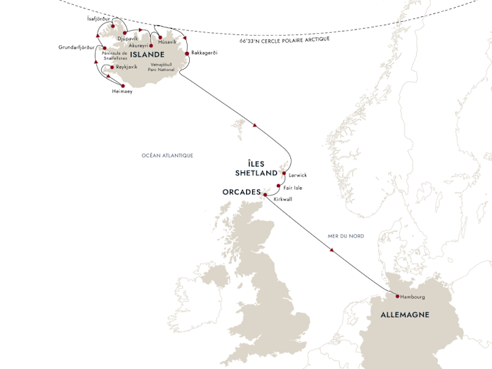 På Shetlandsøerne og Orkney oplever vi vindblæst naturskønhed, rig økultur og historie, der går langt tilbage. Besøg jernalderbyer, vikingeinspirerede byer og øer, hvor fuglelivet trives. Den eventyrlige rejse slutter i Hamborg, der er Tysklands fantastiske havneby.