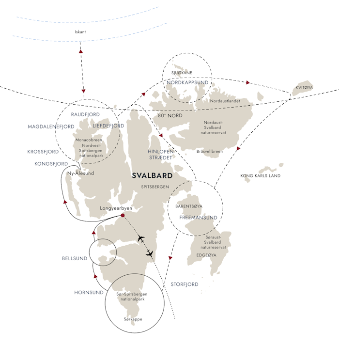 Hvis man ønsker to ekstra dage inden ekspeditionen til at udforske Longyearbyen og dens omgivelser, kan man se denne rejsemulighed. Muligheden omfatter samme sejlrute, men med ekstra arktiske dage på land.