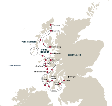 Tag på en eventyrlig rejse fra Glasgow (Fairlie) og sejl til fjerntliggende skotske øer med masser af dyreliv. Oplev fascinerende kultur og historie og deltag i aktiviteter helt tæt på naturen. Vi går i land på strande, tager på guidede vandreture, ror i havkajak og meget mere, mens vi udforsker de forrevne øer.