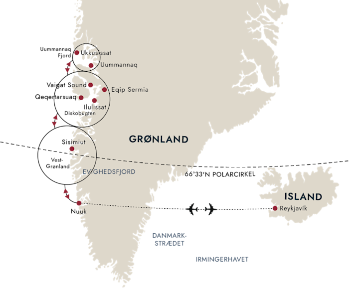 Rejsen starter og slutter i Nuuk med flyrejser fra/til Reykjavík. Der er mulighed for at flyve fra/til København i stedet.