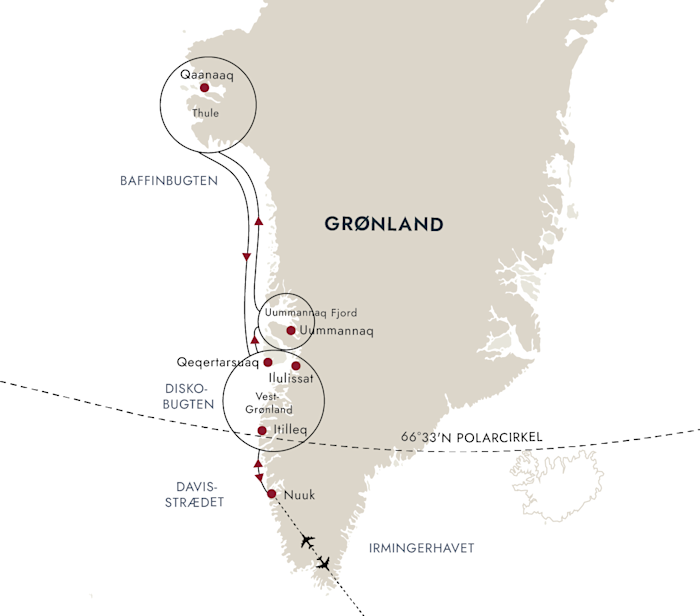 Mulige landgange kan omfatte besøg i små, fjerntliggende samfund som Uummannaq ved foden af det karakteristiske hjerteformede bjerg eller Ukkusissat. Hvis vejret og isen tillader det, udforsker vi Qilakitsoq-stedet, sejler ind i afsidesliggende fjorde eller går i land for at opleve Grønlands rå arktiske landskaber – alt efter hvad naturen tillader.