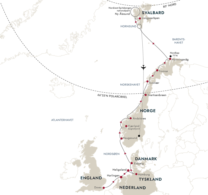 På rejsen fra Dover til Longyearbyen kan man opleve de dramatiske kyster og forårets pragt i Nederlandene (Holland), Danmark, Tyskland og Sydnorge og på Svalbard.