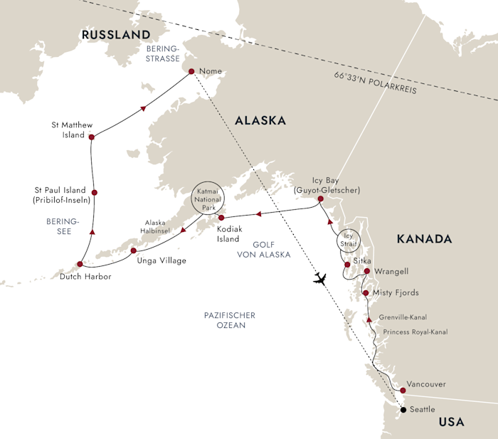 Begeben Sie sich auf eine Expeditions-Seereise von Vancouver nach Nome und erkunden Sie Alaskas zerklüftete Küstenlinie und die abgelegenen Aleuten.