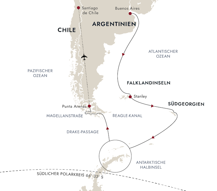 Ihre Expeditions-Seereise in die Antarktis endet in Punta Arenas. Von hier aus fliegen Sie zurück nach Santiago de Chile und nehmen dort ihren Anschlussflug nach Hause – im Gepäck eine Fülle fantastischer Erinnerungen.
