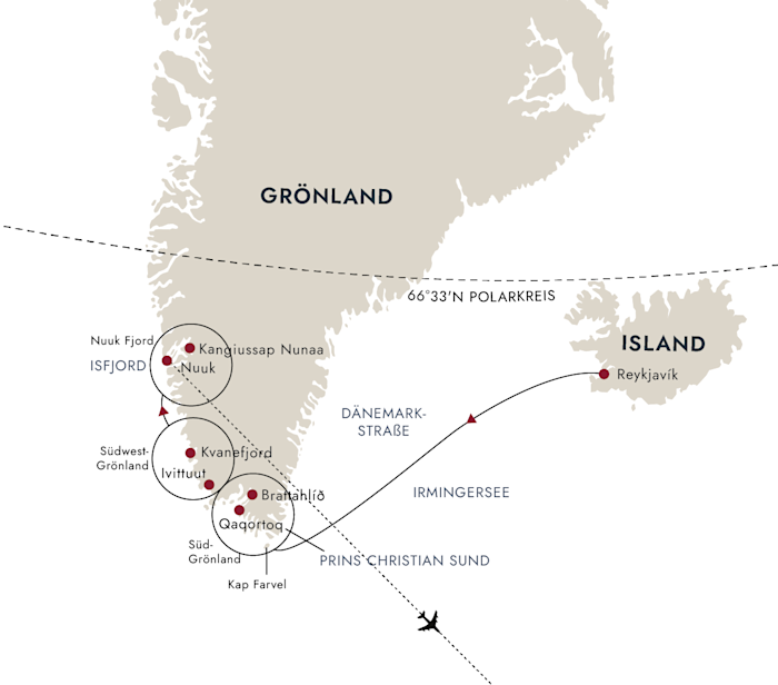 - Flug in der Economy Class von Nuuk nach Kopenhagen nach der Expeditionskreuzfahrt
