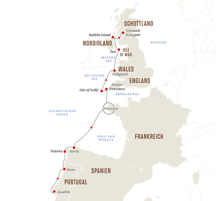 In grauer Vorzeit galten die in den Atlantik ragenden Halbinseln als nicht überwindbare Grenzen und wurden als „Land’s End“ oder lateinisch „Finis Terrae“, also das „Ende der Welt“ bezeichnet. Unsere Reise beginnt in Lissabon und führt Sie entlang der europäischen Atlantikküste zur galicischen Landzunge Fisterra, der bretonischen Region Finistère, zum Land’s End in Cornwall und zur walisischen Halbinsel St Davids.