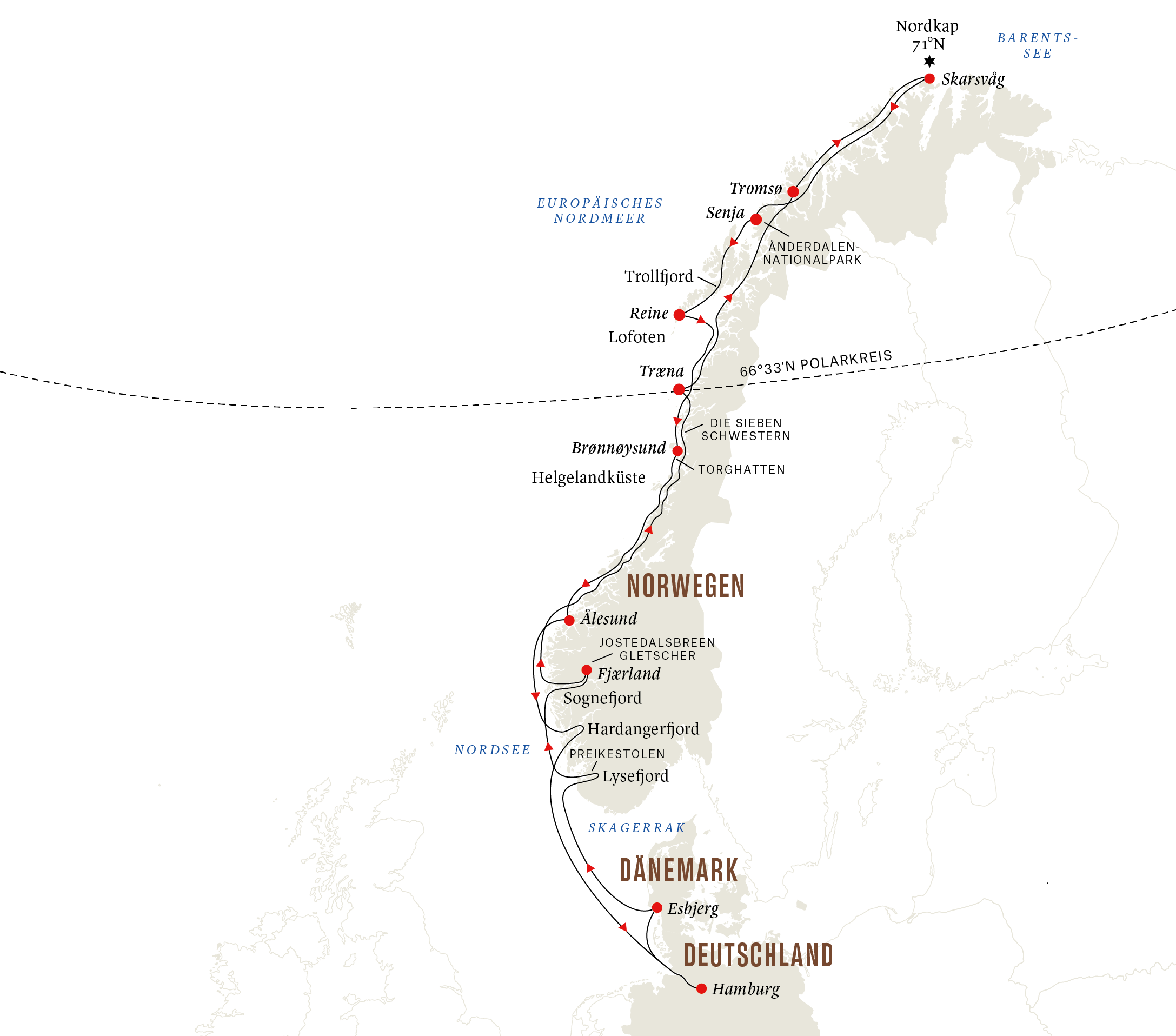 Sie verlassen Hamburg im Sommer und fahren die spektakuläre norwegische Küste entlang bis in die Arktis zum Dach Europas – und zurück.