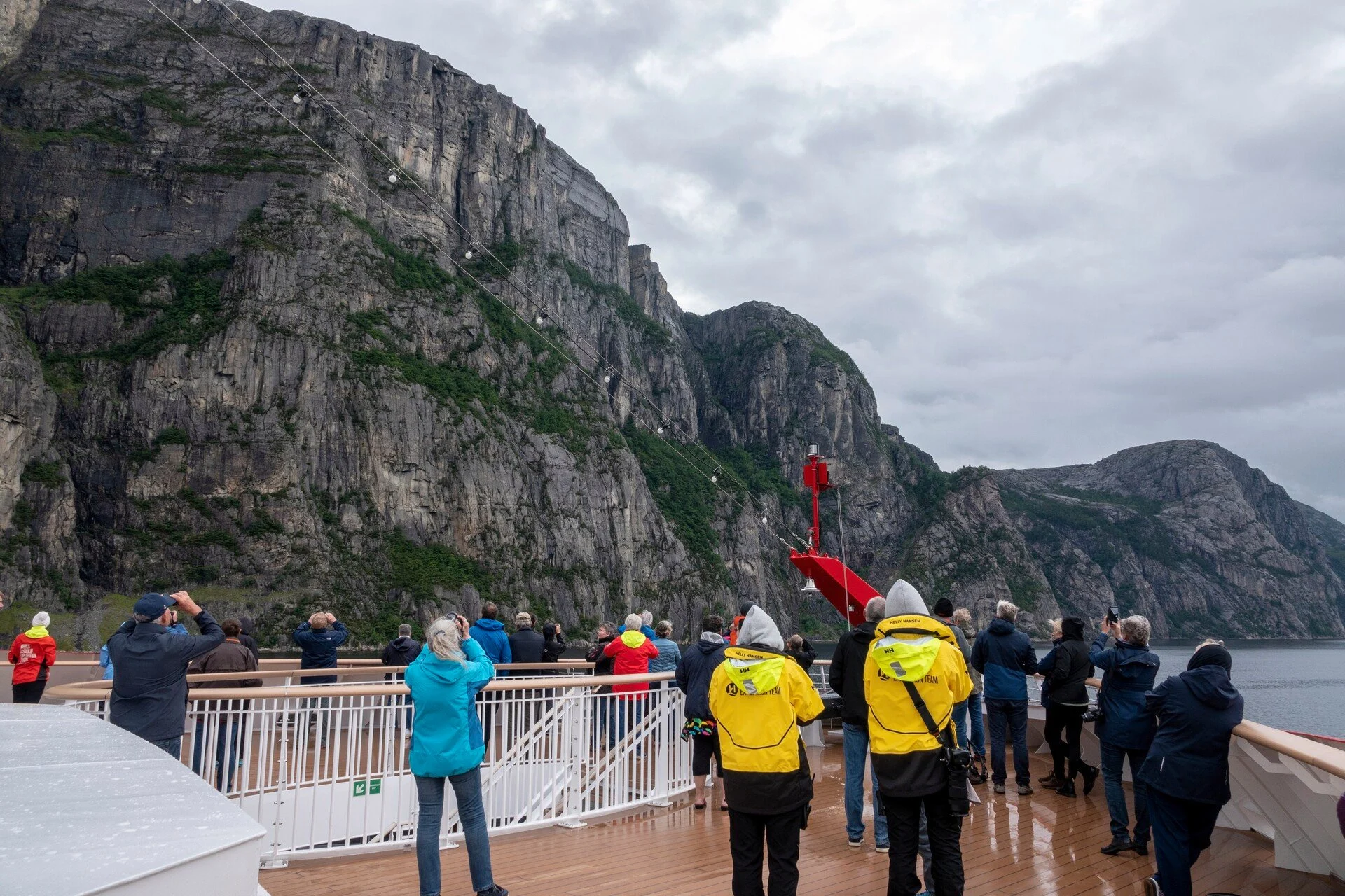 Am frühen Morgen können wir einen ersten Blick auf die norwegische Küste werfen. Ihre kleinen Inseln und die Bergsilhouetten kommen immer näher. Wir lassen schließlich die Nordsee hinter uns und fahren in eine Welt malerischer Meerengen und Fjorde. Wenn es die Wetterbedingungen zulassen, beginnen wir unseren Norwegenbesuch am Lysefjord, einem der schönsten Fjorde des Landes und ein großartiger Ort, um mit unserer Erkundung zu beginnen.