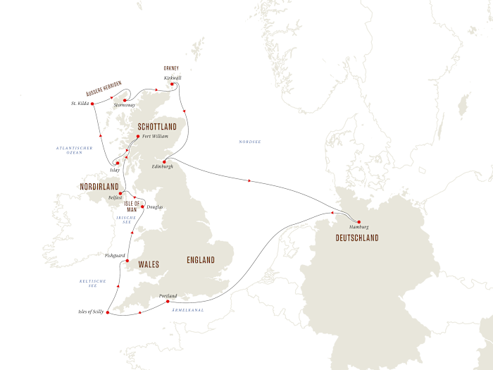 Ihre spannende Expeditions-Seereise zu den Britischen Inseln beginnt in Hamburg und führt einmal rund um Grossbritannien – nach England, Wales, Nordirland, zur Isle of Man, nach Schottland und zu den Hebrideninseln. Entdecken Sie mittelalterliche Burgen, mystische Monumente und imposante Kathedralen und erhalten Sie einen Einblick in die einzigartige Kultur der einzelnen Reiseziele. Entdecken Sie die Geschichte der Wikinger in Douglas, Kirkwall und Stornoway, und besuchen Sie altehrwürdige Brennereien auf der Whiskyinsel Islay.