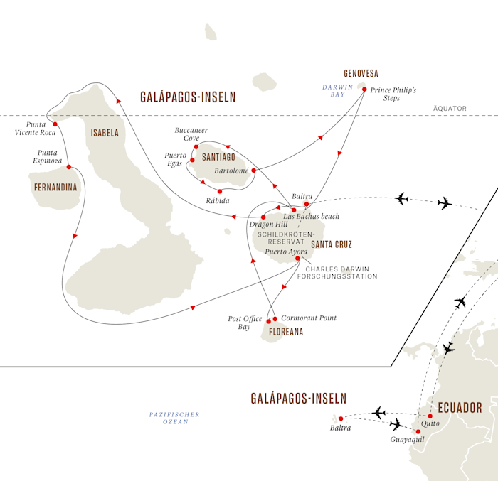 - Ihr Flug von Baltra geht nach Guayaquil. Wenn Sie Ihre Expedition in Quito beenden möchten, informieren Sie bitte Ihre Buchungsstelle