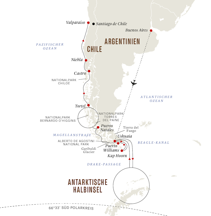 Erleben Sie mit uns ein unvergessliches Abenteuer, wenn wir gemeinsam den eisigen Kontinent der Antarktis, Patagoniens spektakuläre Nationalparks und die atemberaubenden chilenischen Fjorde erkunden.