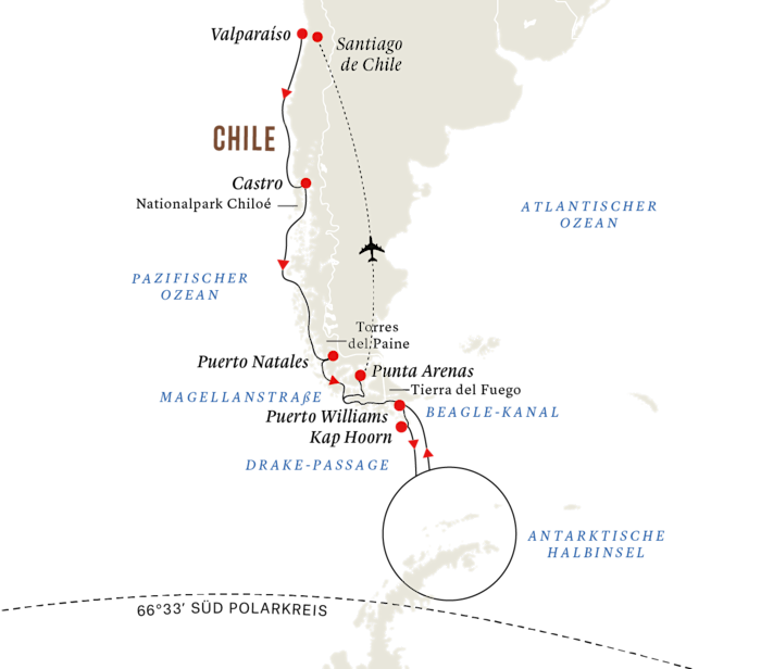 Ihre Expeditions-Seereise in die Antarktis und nach Patagonien geht in Punta Arenas zu Ende. Von hier aus fliegen Sie zurück nach Santiago de Chile – im Gepäck eine Fülle fantastischer Erinnerungen, die Sie zweifellos noch lange begleiten werden.