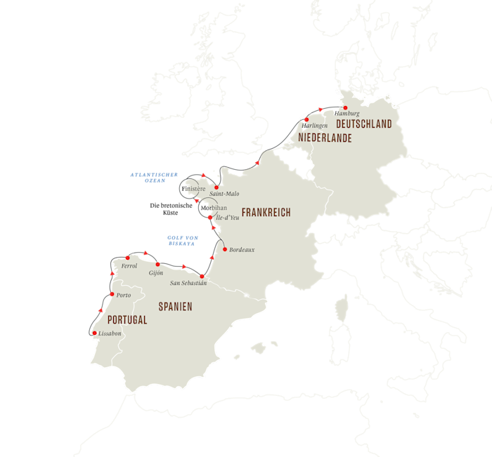 In Frankreich erwarten Sie fantastische Eindrücke in Bordeaux, auf der Île-d’Yeu und in der Bretagne. Freuen Sie sich auf wilde Küstenlandschaften, malerische Fischerdörfer, mittelalterliche Städte und eine reiche Seefahrtgeschichte. Entdecken Sie die Kanalstadt Harlingen, bevor Ihre Abenteuerreise entlang der europäischen Atlantikküste im kosmopolitischen Hamburg endet.