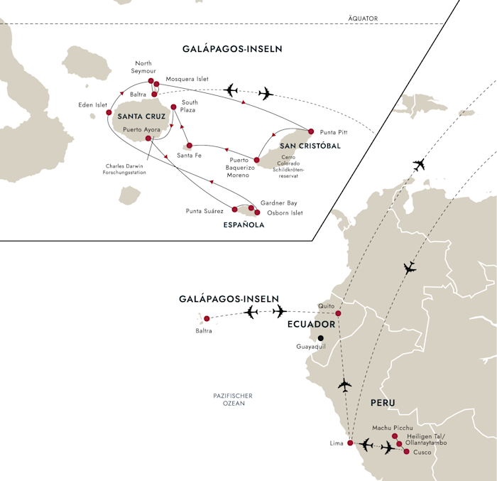 Nach Erkundung des historischen Zentrums von Quito und Besuch des Äquators reisen wir zu den Galapagosinseln und erleben ein unvergessliches Seeabenteuer. Wir halten Ausschau nach bekannten Tierarten wie Riesenschildkröten, Meerechsen und Blaufusstölpeln. Auf dieser Expeditions-Seereise gibt es viele Möglichkeiten für unterschiedliche Aktivitäten und in Begleitung eines aus einheimischen Reiseführern bestehenden Expeditionsteams kommen Sie bei Fahrten in unseren kleinen Expeditionsbooten, mit Kajaks und Glasbodenbooten den vielen Naturwundern näher.