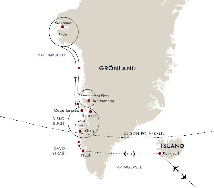 Diese Seereise beginnt und endet in Nuuk mit Flügen von/nach Reykjavík. Hier finden Sie auch alternative Anschlussflüge von/nach Kopenhagen.