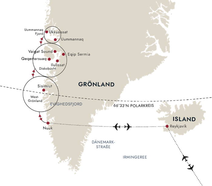 Diese Seereise beginnt und endet in Nuuk mit Flügen von/nach Reykjavík. Hier finden Sie auch alternative Anschlussflüge von/nach Kopenhagen.