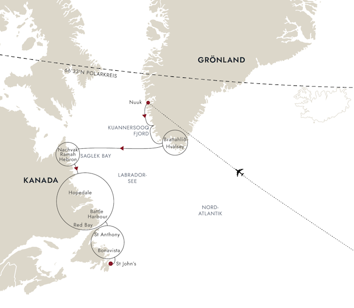 Reisen Sie gemeinsam mit uns von Nuuk aus entlang der Westküste Grönlands und durch die Labradorsee und entdecken Sie Neufundland und das subarktische Kanada.