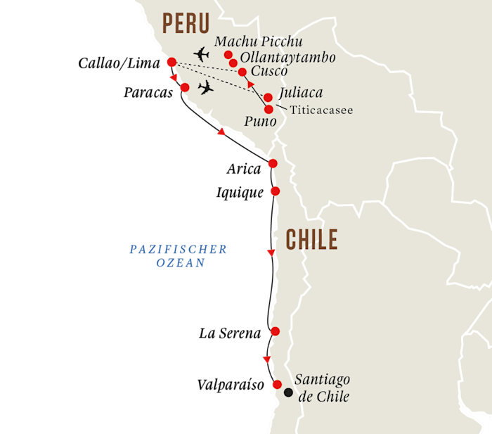 Sie stechen in See und erleben die Islas Ballestas mit ihrer beeindruckenden Tierwelt oder sehen sich die rätselhaften Nazca-Linien an. In Chile erkunden Sie die Wüsten in der Nähe von Arica und Iquique, die klassische Architektur von La Serena und das farbenfrohe „Juwel des Pazifiks“, Valparaíso.