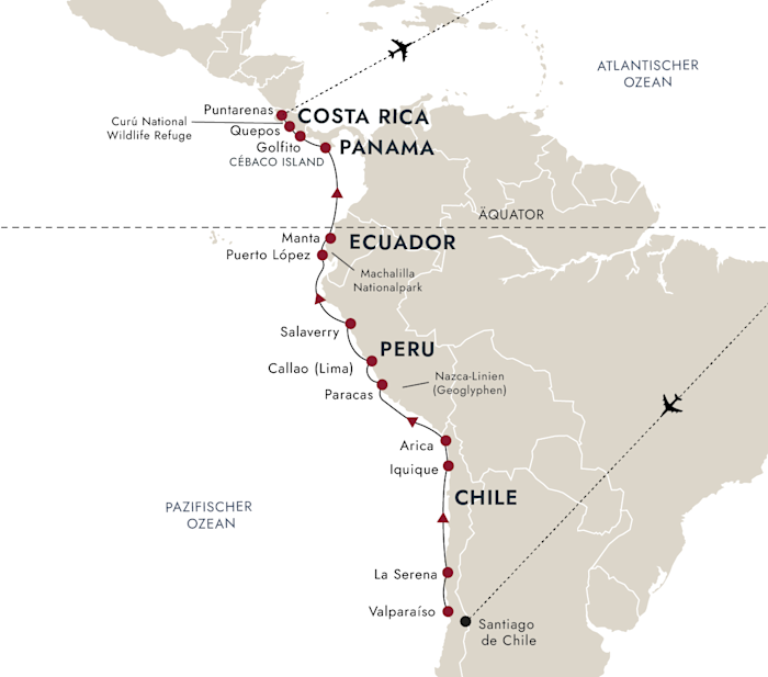 Begeben Sie sich mit uns auf eine aufregende Expeditions-Seereise entlang der lateinamerikanischen Pazifikküste: von Chile über Peru, Ecuador und Panama nach Costa Rica.
