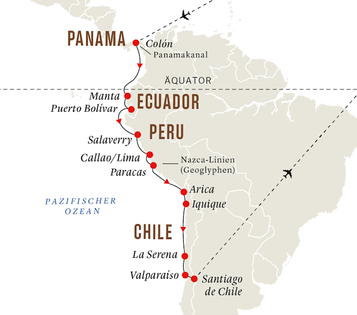 Begeben Sie sich auf ein Abenteuer im Pazifik, das mit einer Fahrt durch den legendären Panamakanal beginnt. Vom Dschungel Mittelamerikas bis hin zu den Wüsten Chiles erleben Sie ein Kaleidoskop an Kultur, Farben und Attraktionen, während wir einige der wichtigsten Sehenswürdigkeiten Lateinamerikas kennenlernen.