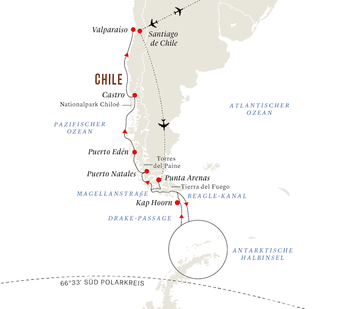 - Flug in der Economy Class von Santiago de Chile nach Punta Arenas vor der Expeditions-Seereise