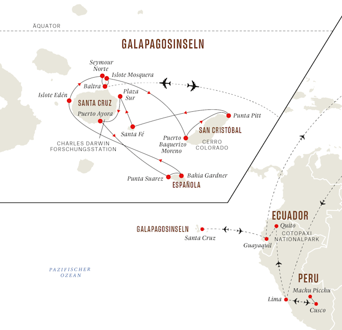 Begleiten Sie uns auf eine historische und ökologische Entdeckungsreise, auf der wir die verlorene Hochkultur der Inkas in Peru besser kennenlernen, Zeit mit der Erkundung von Quito verbringen, einen noch aktiven Vulkan in den ecuadorianischen Anden besteigen und schließlich auf den Spuren von Charles Darwin die unvergleichlichen Galapagosinseln erkunden.