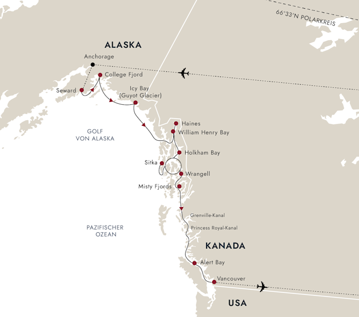 Nach einem landschaftlich reizvollen Transfer von Anchorage nach Seward, starten wir unsere Expeditions-Seereise nach Vancouver, auf der Sie die bemerkenswerte Vielfalt der Natur und Kultur Alaskas und der Provinz British Columbia hautnah erleben. Bewundern Sie die hoch aufragenden Berge, deren Hänge mit uralten Regenwäldern bedeckt sind, und lassen Sie sich von glitzernden Gletschern und tiefblauen Fjorden verzaubern. Auf dem Weg können Sie Ausschau nach den zahlreichen Wildtieren Alaskas halten, darunter Weißkopfseeadler, Elche, Bären, Stellersche Seelöwen, Otter, Orcas, Buckelwale und unzählige Seevögel.