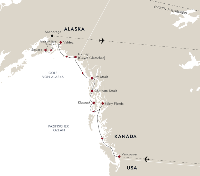 - Je nach Abflugzeit kann eine Übernachtung in Anchorage erforderlich sein.