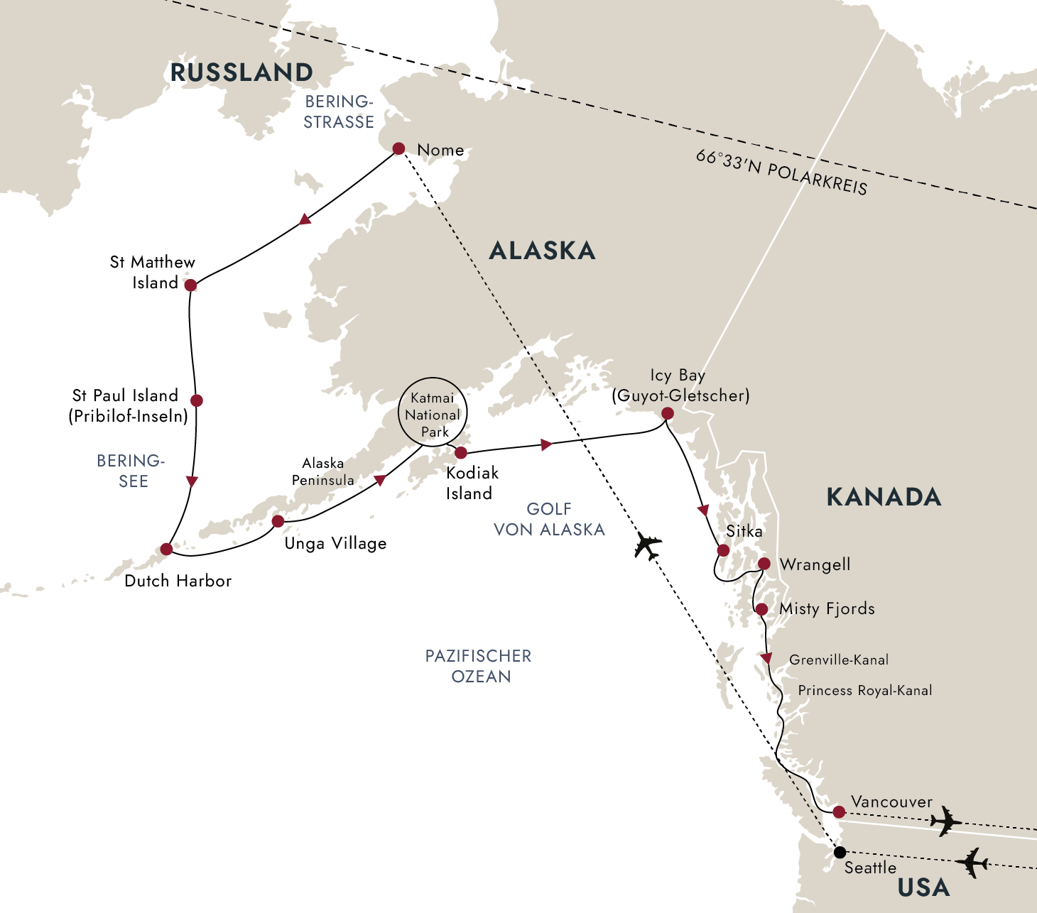 - Flüge in der Economy Class von Deutschland nach Nome (via Seattle) und zurück ab Vancouver inklusive aller Steuern, Rail&Fly-Ticket hin und zurück