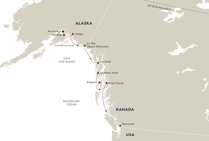 Begleiten Sie uns auf ein Abenteuer von Vancouver nach Whittier, während wir uns tief in den Prinz-William-Sund vorwagen und Ihnen die majestätische Landschaft, die traditionelle Kultur Alaskas und die Tierwelt des gemäßigten Regenwaldes zeigen. Wir reisen durch die Inside-Passage und den Panhandle von Alaska, die für ihre tiefen Fjorde, eisigen Gletscher und hoch aufragenden Berge bekannt sind. Während der Fahrt halten wir Ausschau nach Walen, Orcas und Tieren an der Küste, darunter Bären und Elche.