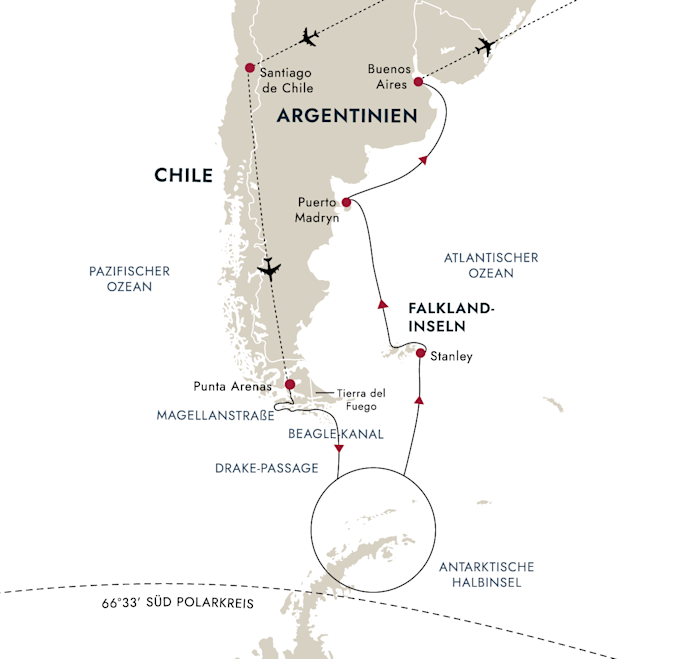 - Flug in der Economy-Class von Deutschland nach Punta Arenas (über Santiago de Chile) vor der Expeditions-Seereise und von Buenos Aires nach Deutschland nach der Expeditions-Seereise, inklusive aller Steuern, Rail&Fly-Ticket hin und zurück