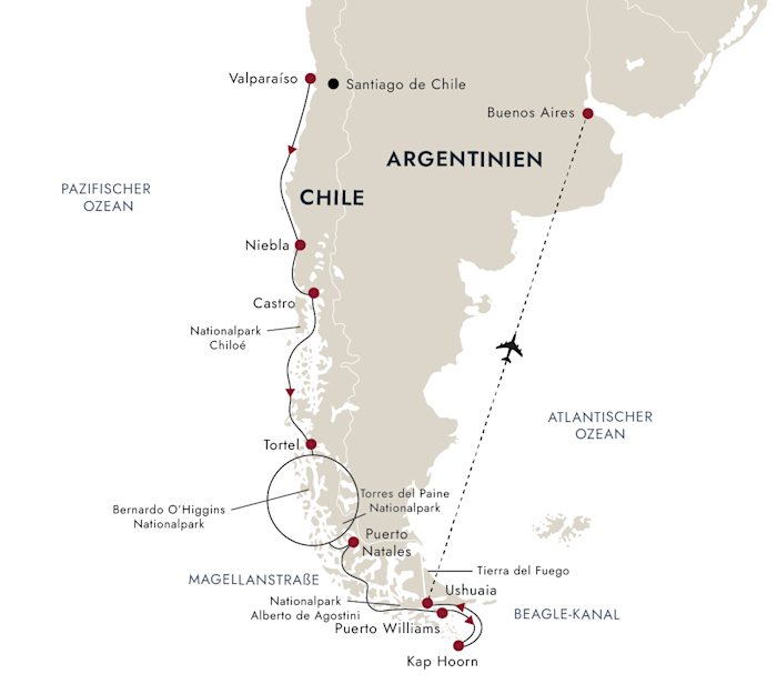 Von der prächtigen Hafenstadt Valparaíso aus, die zum UNESCO-Weltkulturerbe gehört, brechen wir auf in Richtung Süden zum malerischen Niebla und dem charmanten Castro. Auf der Weiterfahrt entlang der Westküste nach Patagonien entdecken Sie atemberaubende Landschaften und werden von abgelegenen Gemeinden empfangen, um etwas über ihren Alltag zu erfahren. In Puerto Natales haben Sie die Möglichkeit, den weltberühmten Nationalpark Torres del Paine mit seinen hoch aufragenden Granitbergen zu besuchen.