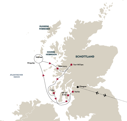 Von Glasgow (Fairlie) aus führt Sie diese Reise zu den wilden und abgelegenen Inseln der Hebriden. Entdecken Sie mit uns raue, von Heidekraut dominierte Landschaften, weiße Sandstrände und malerische historische Städte. Wenn wir Kurs auf Fort William nehmen, können Sie die atemberaubenden Landschaften der Highlands mit ihren hohen Bergen und von Gletschern geformten Tälern bewundern.