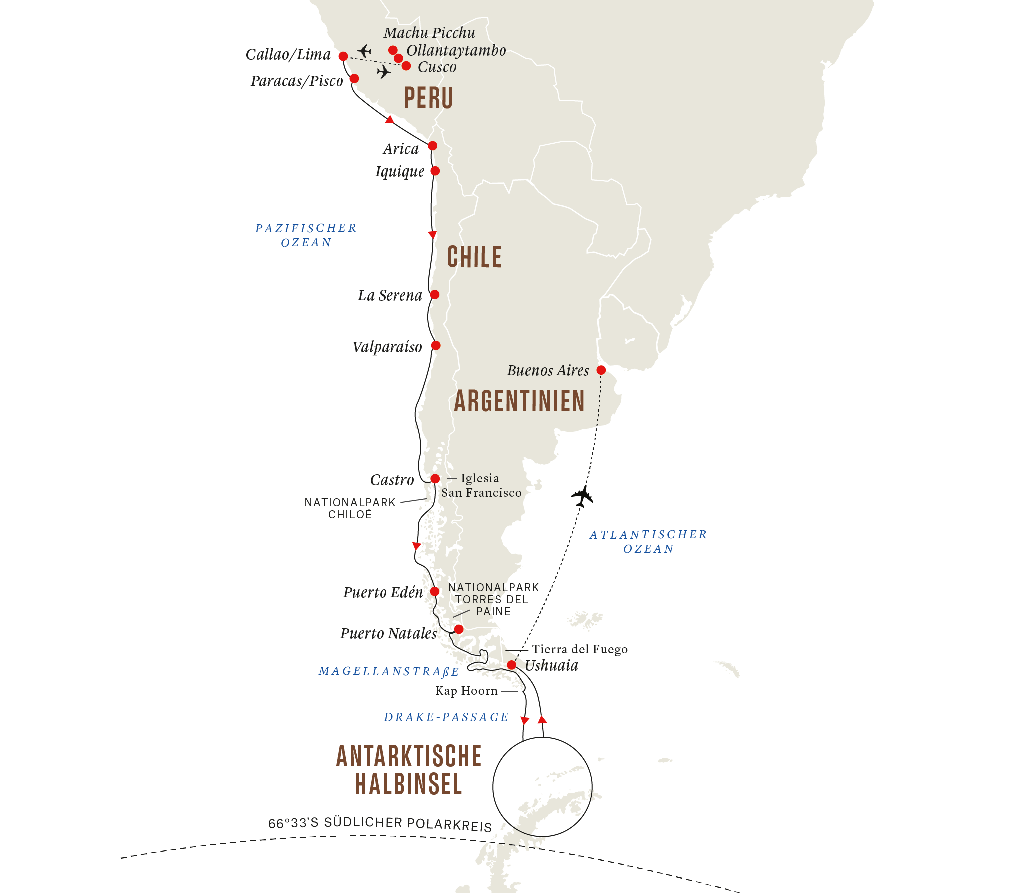 Wir bringen Sie zu den Hochburgen der geheimnisvollen Inka und zu majestätischen Eisbergen, befahren mit Ihnen die vielfältige Pazifikküste Südamerikas und durchqueren den eisigen Kontinent der Antarktis.