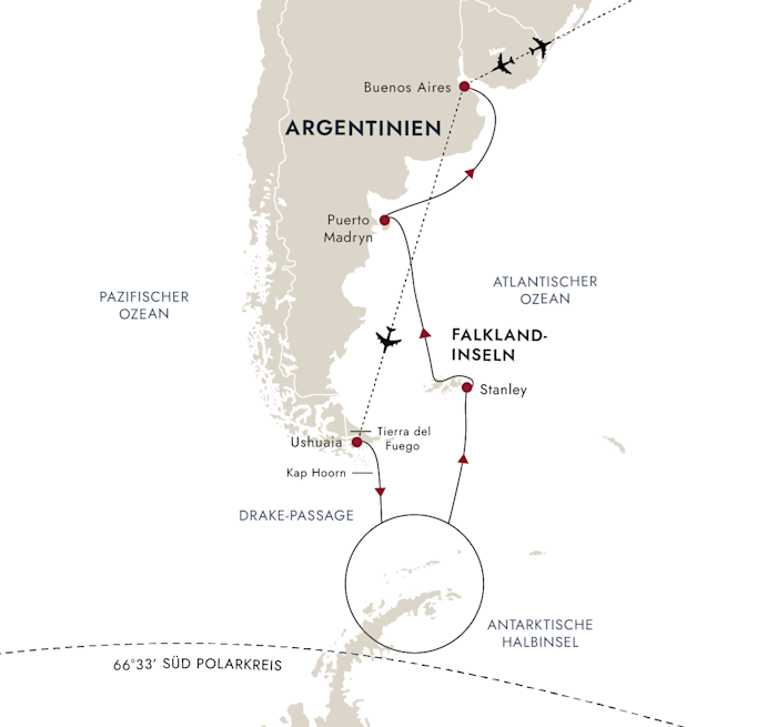 Ihre Reise beginnt mit einem Flug von Deutschland nach Buenos Aires.